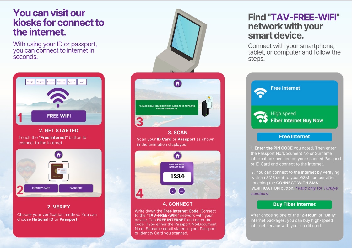 TAV Free Wifi service is provided throughout the Domestic and International Terminals. To do this, connect to the TAV-FREE-WIFI internet network and select the free 1 hour option from the page that opens. Country code and phone number are entered on the page that appears and the instructions are followed. You can benefit from the service by entering the code sent automatically via SMS. Passengers without roaming are given free passwords with their ID cards via Kiosk devices placed in various areas of the terminals.