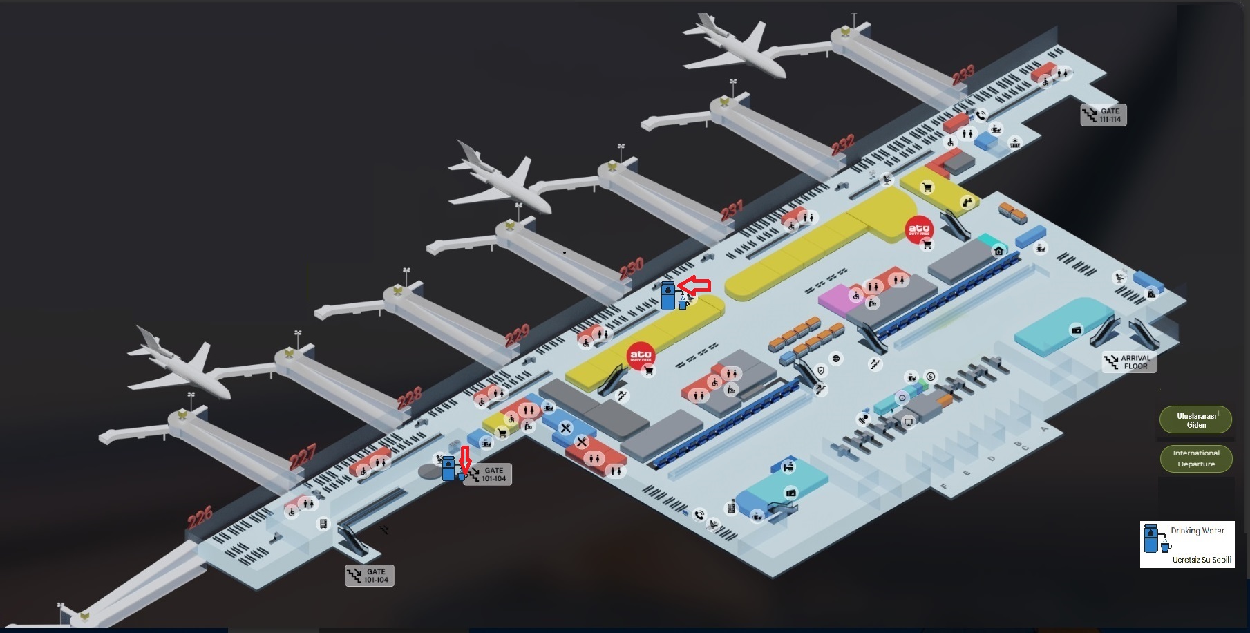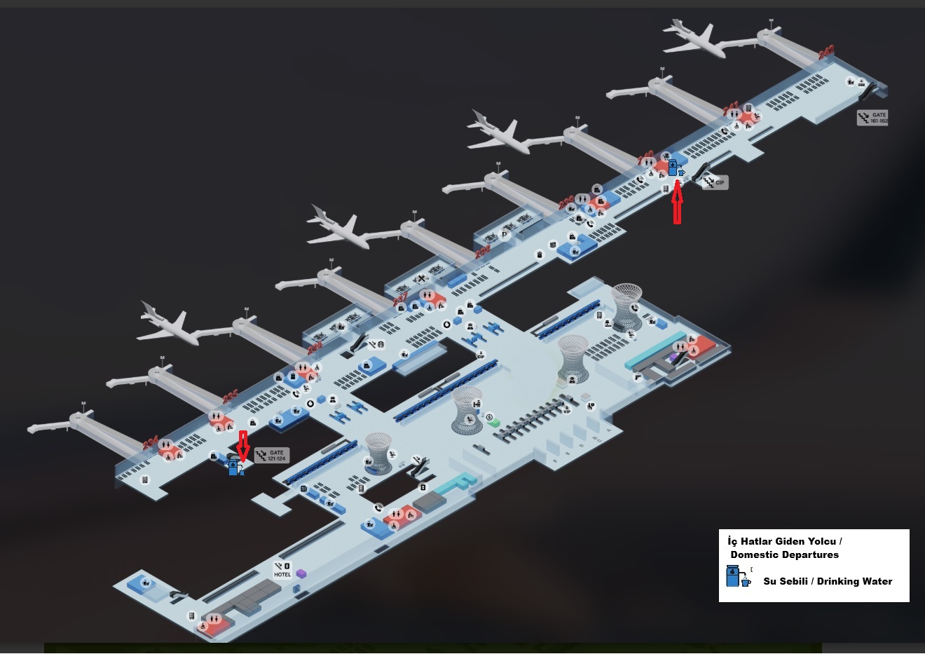 İç Hatlar Terminali Giden Yolcu Katı Gate 240 yanıİç Hatlar Terminali Gelen Yolcu Asma Kat Gate 237 karşısı