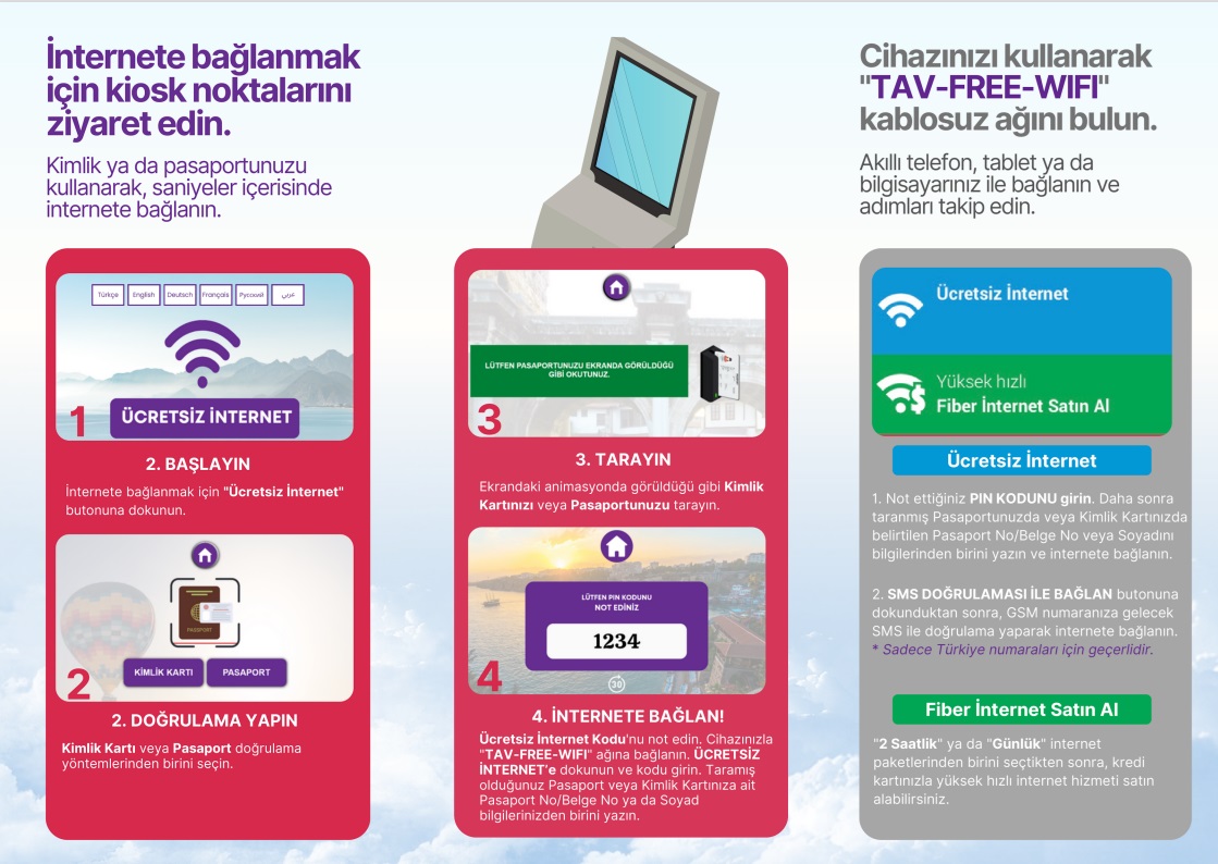 TAV Ücretsiz Wifi hizmeti İç ve Dış Hatlar Terminali genelinde verilmektedir. Bunun için TAV-FREE-WIFI internet ağına bağlanın ve açılan sayfadan 1 saat ücretsiz seçeneğini seçin. Açılan sayfada ülke kodu ve telefon numarası girilir ve talimatlar takip edilir. SMS ile otomatik olarak gönderilen kodu girerek hizmetten yararlanabilirsiniz. Terminallerin çeşitli alanlarına yerleştirilen Kiosk cihazları aracılığıyla, dolaşım hakkı bulunmayan yolculara kimlik kartlarıyla birlikte ücretsiz şifre verilmektedir.